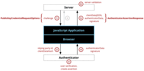 PublicKeyCredential, 包括:identifier: 标识符response: 认证器客户端请求的回应clientData: 凭据上下文, 包括挑战与发起请求的来源authenticatorData: 凭证, 签名, 签名计数器signature: 包含clientDataJSON与authenticatorData对象